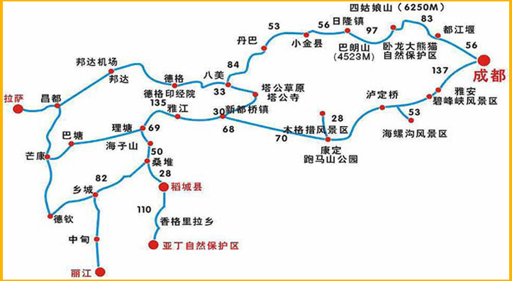 丹巴、小金縣、達(dá)維、四姑娘山、日隆、雙橋溝、長(zhǎng)坪溝、都江堰、成都。