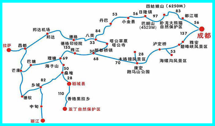 成都、雅安、二郎山隧道、折多山、新都橋、高爾寺山、雅江、剪子灣山、卡子拉山、理塘、毛埡大草原、兔子山、海子山自然保護區(qū)、稻城、赤土河谷 、日瓦、亞丁、珍珠海、沖古寺、仙乃日神山、央邁勇神山、奔子欄、金沙江、飛來寺、梅里雪山、瀾滄江、明永冰川、中甸、麗江、瀘沽湖。