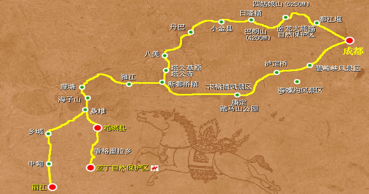 成都,雅安,青衣江,二郎山,康定,九龍,五須溝,新都橋,稻城,亞丁村,貢嘎山,塔公寺,八美,丹巴