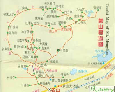 蒙頂山景區(qū)由蒙山和百丈湖兩個主景區(qū)組合而成,是四川首批省級風景名勝區(qū)之一。座落在名山縣境內(nèi),距成都110公里,離雅安市15公里,318國道縱貫景區(qū),成都-雅安高速公路兩條引道與蒙山和百丈湖直接相連,交通十分方便。 蒙山,橫亙于名山縣城西北側(cè),山勢北高南低,呈東北一西南帶狀分布,延伸至雅安境內(nèi)。山體長約10公里,寬約4公里。蒙頂五峰環(huán)列,狀若蓮花,最高峰上清峰,海拔1456米。從蒙頂西眺可見峨眉、瓦屋、周公諸山。向東俯視,原野平疇,山巒起伏,溪澗縱橫,風景如畫?,F(xiàn)存建筑古剎永興寺、千佛寺、凈居庵等寺廟座落于茶園翠靄茂林間,紅墻梵宇,別增情趣。 蒙山因“雨霧蒙沫”而得名,這里因常年雨量達2000毫米以上,古稱“西蜀漏天”。西麓雅安有“雨城”之名,又有“雅安多雨,中心蒙山”之說。雨多而形成云多、霧多的景象。春夏秋季,從山巔俯瞰,云霧飄浮于山嶺溝壑之間,小山浮露,恰似仙山瓊閣。冬天從山下仰觀,冰絲雪掛,山崗云繞,亦真亦幻。日出時金光漫射,紅云飄浮。傍晚遠望名山、雅安兩城萬家燈火,如繁星落地,景象萬千。 蒙山是中國種茶業(yè)和茶文化的發(fā)祥地之一,早在兩千多年前的西漢時期,蒙山茶祖師吳理真好開始在蒙頂馴化栽種野生茶樹,開始了人工種茶的歷史。唐宋時是蒙山茶的極盛時期。從唐玄宗天寶元年(724年)被列為貢品,作為天子祭祀天地祖宗的專用品,在民間,蒙頂茶歷來被看作祛疾去病的神來之物。因此,歷史悠久的蒙頂茶被稱為“仙茶”,蒙山被譽為“仙茶故鄉(xiāng)”。