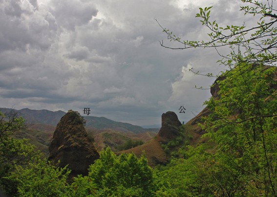 公山、母山均呈紅褐色,屬丹霞地貌,兩山相距幾百米,遙相呼應(yīng),盎然成趣。公山高約40米,如破土春筍,陽剛挺拔,昂然兀立,赤條條直刺天穹。母山高約100余米,底部較強(qiáng),中部肥碩,峰頂略呈園形,中有天然裂縫到底部,形成一峽洞,可容1人悠悠穿過。遠(yuǎn)望這對奇妙而又栩栩如生的怪峰奇石,浮想聯(lián)翩,有“大地展示乾坤奇景,眾人崇拜陰陽平衡”錦句所概括。更令人不可思議的是,四周的三山巒,不是林木森森就是芳草萋萋,唯有這公母二山,赤條條裸露著紅褐色的巖石,母山峰頂卻又長著一顆不知名的古樹,四季常青。如陽剛挺拔直刺天穹,陰柔嬋娟敞開心扉。