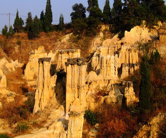 黃聯(lián)土林是在約一億年前的冰河時(shí)期,經(jīng)冰水沉積流動(dòng)和受新地殼運(yùn)動(dòng)影響,龜裂的沙粒礫層被地表水長(zhǎng)年累月的滲透、沖刷、加深、擴(kuò)大、立柱而形成的“自然雕塑博物館”。土林狀如云南石林,質(zhì)地卻是黃色砂礫巖土,大多頂部已膠質(zhì)鈣結(jié),不易被風(fēng)化沖刷,故能長(zhǎng)久挺立不垮塌。黃聯(lián)土林全景6000多畝,其中自然景觀800多畝,配套石榴園200多畝,景區(qū)周邊造林綠化形成森林面積5000多畝。